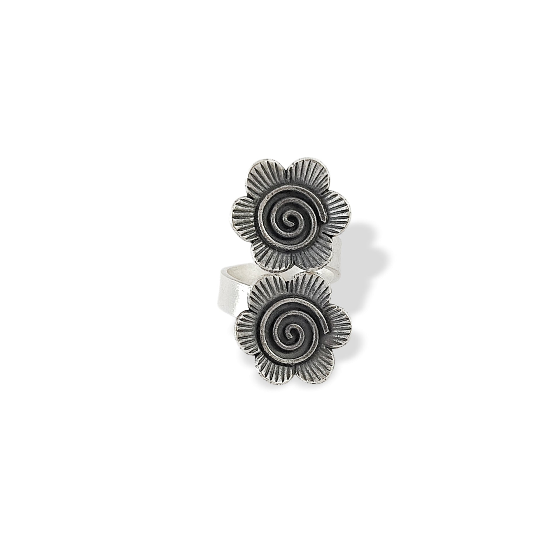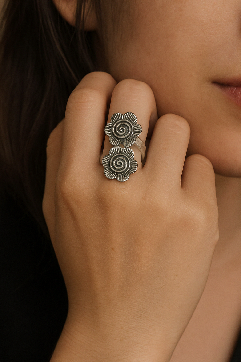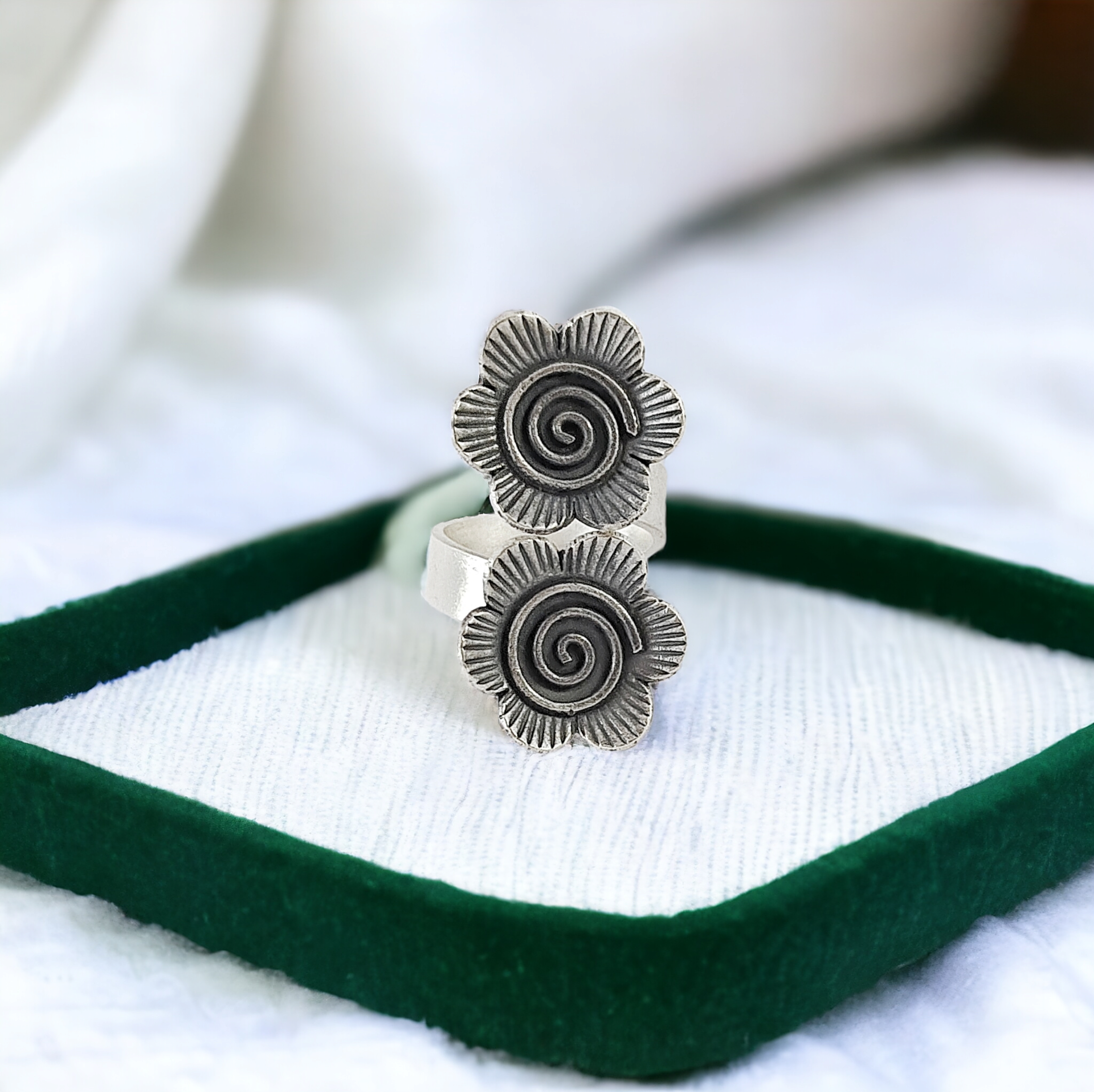 🌸 Double-flower flex – This oxidised dual flower ring slays with two dainty blooms and a vintage-boho twist.