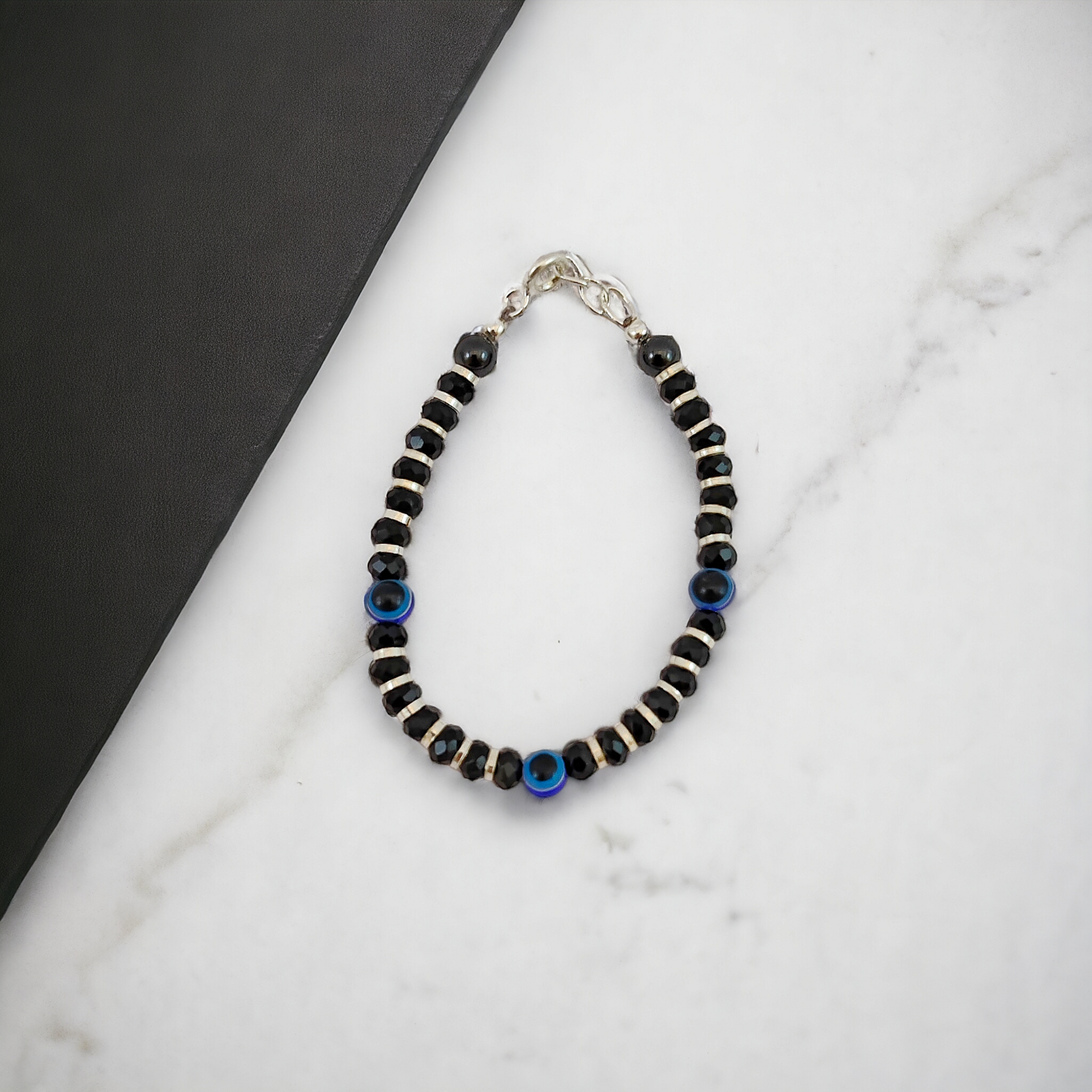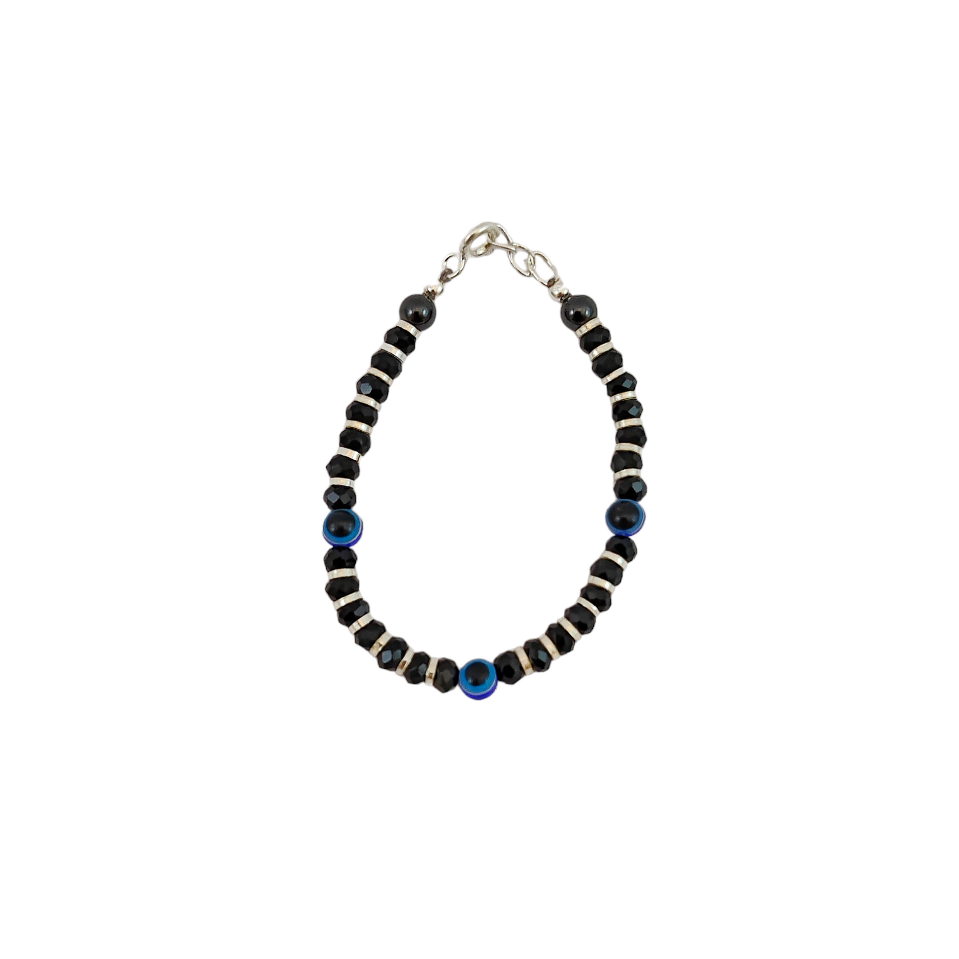 🌟 Three mini evil-eye charms, accented with tiny silver/black beads—classic nazariya symbolism meets baby-safe charm