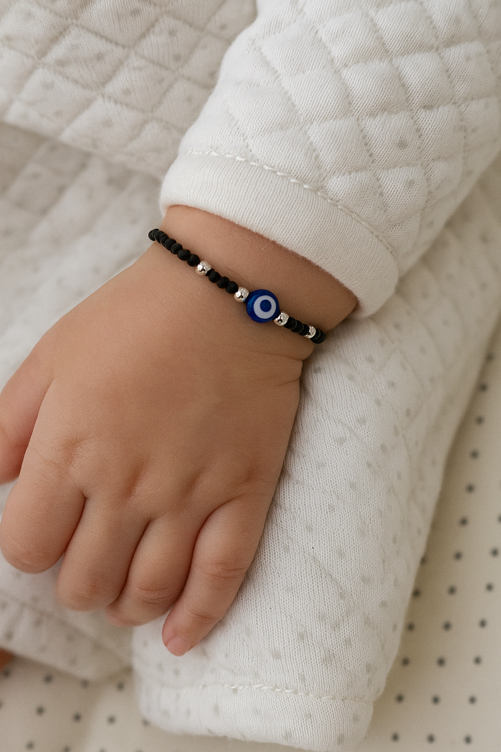 🧿 Striking evil-eye charm(s) nestled among black beadwork—classic blue-eye talisman believed to ward off negative vibes and bring protection